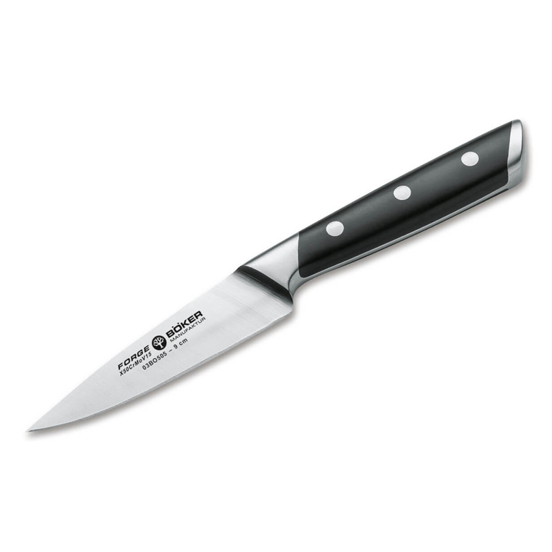 The Kitchen Knife line Boker Forge combines innovative and dynamic designs with a classic material selection, at a premium quality level. The attractive, eye-catching design lines distinguish this series significantly from the masses of average kitchen knives, without being too flashy. In addition, the Boker Forge series is convincing with a very attractive price-performance ratio. The knives are made from X50CrMoV15 chrome–molybdenum-vanadium stainless steel, are ideally balanced and provide perfect handling due to the ergonomic grip design. Black handle scales made of special high-quality ABS synthetic material are durably combined with three stainless steel rivets and are attached to the completely continuous tang without rivets. The design of the blades, including the transition to the bolster, allows easy sharpening and ensures long-term perfect function for the knives in combination with proper care. Please only hand wash the knives, do not place in dishwasher. Moreover, the Boker Forge series convinces with an incredibly attractive price-performance ratio. The knives are delivered in a high-quality gift box.