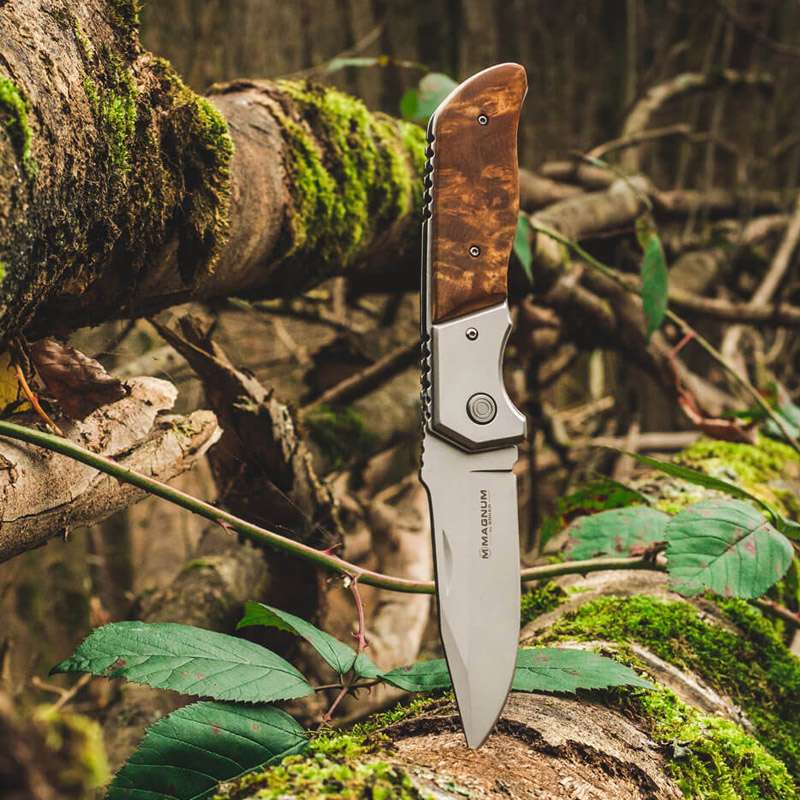 The Magnum Forest Ranger is another successful Magnum model, which has been in constant demand as a two-hand knife. And since the customer is always right, we followed their demands. Even the most challenging tasks can easily be carried out with the sturdy and imposing knife. The finely blasted 440A clip point blade is protected against unintentional folding by the linerlock mechanism. The stainless steel bolsters and the generous root wood scales make the knife a true piece of jewellery. Thanks to the included pocket clip, the knife is always ready to hand for its next use.